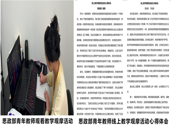 思政部通过此次线上教学观摩活动的举办,有效搭建了线上教学期间思政课教师之间沟通交流的平台,为思政课教师之间广泛交流、取长补短、共同进步提供了学习机会,尤其是青年教师在教学观摩活动中受益匪浅。思政部青年教师胡爽老师观摩后撰写观摩课心得体会写道:“在林老师课堂上,无论是对理论知识点的讲授,还是与学生的有效互动、课堂组织管理的把握等,都受益匪浅,感受颇深,也从中汲取能量,查缺补漏,让自己的课堂教学更完善,结合自己的教学实际积极思考,取长补短。” 思政部青年教师弓铭录老师撰写观摩课心得体会写道,“在听课的过程中,感受到了林老师对课程进行了精心的设计,采用提问、视频播放等多种手段创设情景,多渠道地给学生提供教学信息,拓宽视野,从而激励学生学习的强烈兴趣,积极主动参加各项学习活动。通过线上观摩开阔了眼界,同时也看到了自己的不足,更加明确了今后教学的努力方向,也更加深刻地体会到作为一名青年教师任重而道远。”