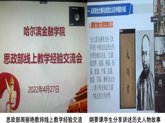 《中国近现代史纲要》教研室主任周丽艳教师进行了分享,纲要教研室全体教师多次进行线上集体备课,形成特色鲜明具有创新性的上课流程,课前、课中、课下“三段一体”,线上多种方式混合教学。一是课前分享历史人物与事件。小组成员对所选历史人物与事件做成PPT后发给教师,针对老师提出的问题进行修改,实现生生,师生多向互动。二是课外知识拓展与延申。每次课前教师会在班级微信群发布下次课外知识点,学生可利用课下时间去查找资料,学生遇到的困惑会及时与教师交流,形成自己观点。三是讨论热点话题,深化课程内容线上讨论课将社会热点与中国近现代历史有机融合,学生在腾讯会议参与发言时,会形成集体讨论。四是实践课精彩纷呈。让学生讲述自己家乡红色资源,拍摄社会正能量VR,学生置于其中,从学生视角由小故事映射大道理。